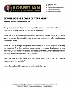 - Expanding the Power of Your Mind™ (keynote speech) Sales Motivation & Magic. Robert discusses how to expand the power of your mind (and your sales) using magic to show how the “impossible” is achievable. Under Robert’s skillful guidance, your audience will transform their sales communication skills and increase their ability to build trust, melt resistance and close more sales.