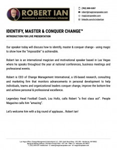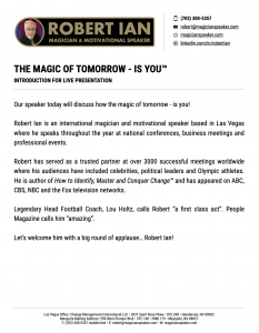- Nationally Recognized Expert: A nationally recognized expert on conquering change – Author, Speaker & Magician Robert Ian helps individuals, teams and organizational leaders expand the power of their mind to improve the bottom-line and achieve personal and professional excellence. Robert will astound you with magic & illusion. You’ll discover how the “impossible” is achievable. Even more, Robert will get you thinking in new ways about work, life and success.
